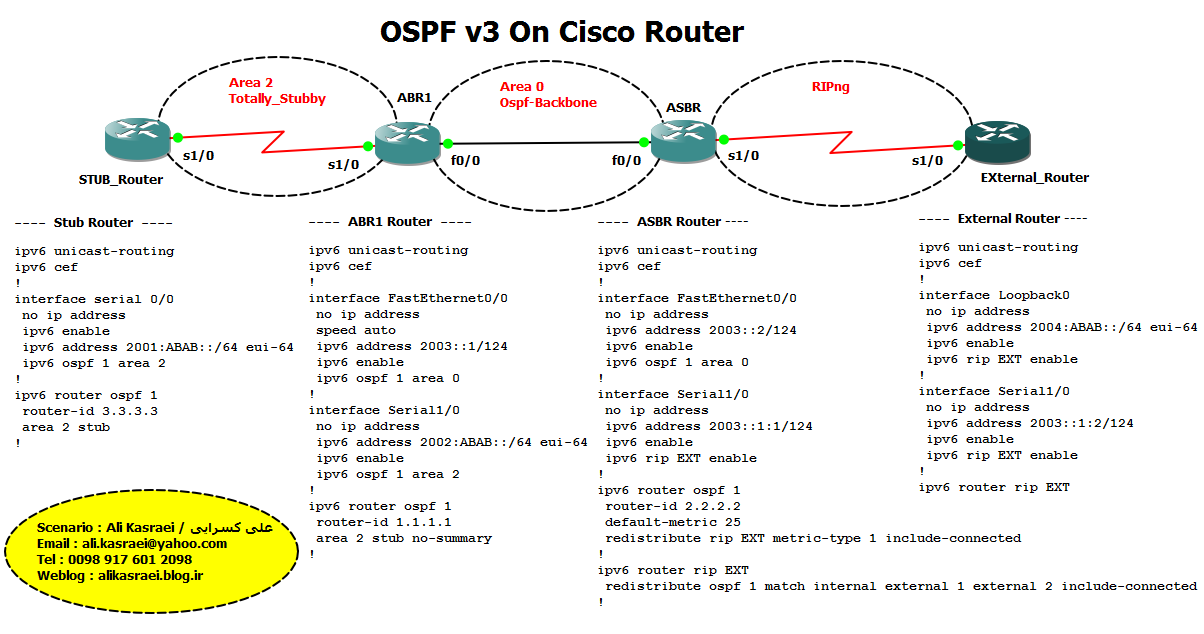 در واقع (Open Shortest Path First (OSPF یک روتینگ پروتکل داینامیک برای تکنولوژی IP محسوب شده و link-state protocol طبقه بندی می شود . این پروتکل تصمیم گیری هایش را بر اساس وضعیت لینک های اتصالات انجام می دهد که این داده ها را از روی اینترفیس و وضعیت همسایگانش بدست می آورد بطوریکه هر روتر از توپولوژی کل شبکه آگاه است . اطلاعات اینترفیس شامل Prefix های IPv6 و Network Mask ، نوع شبکه متصل ، نوع روترهای متصل به شبکه و ... می باشد که این داده ها توسط انواعی از پیامها در کل شبکه تبلیغ می شوند که بدان (link-state advertisements (LSAs می گویند .لازم به ذکر است که OSPFv3 از IPv6 پشتیبانی می کند . برای اطلاع بیشتر به مطالعه RFC 2740 بپردازید . در خاتمه تعدادی از دستورات مانیتورینگ مربوطه به این سناریو را برای دوستان عزیز معرفی کرده و البته یا سرچ در اینترنت بسیاری دیگر را خواهید یافت . و اینکه این سناریو با روترهای سری C7200 ورژن 15.2 طراحی شده است . یا حق
